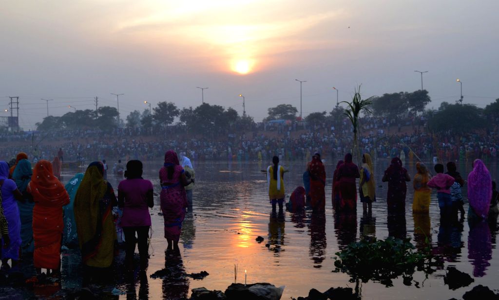 जल में खड़े होकर अर्घ्य: व्रती पवित्र नदी, तालाब या घर के आस-पास बनाए गए घाट पर कमर तक जल में खड़े होते हैं।